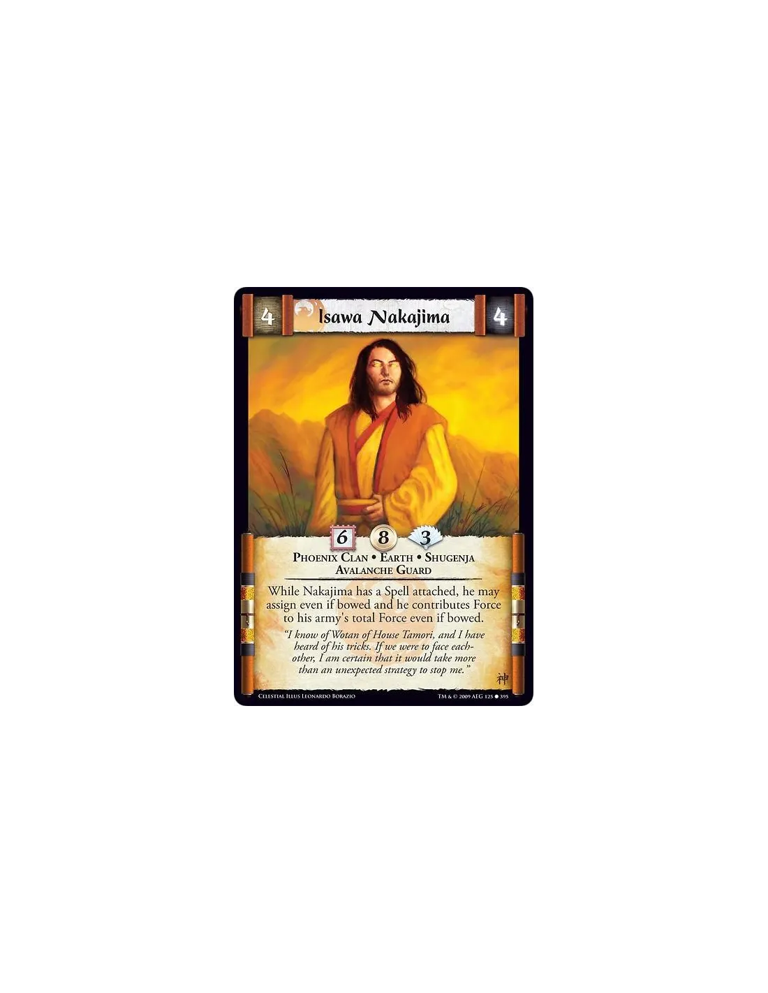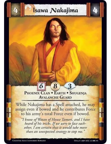 Phoenix Clan • Earth • Shugenja • Avalanche Guard While Nakajima has a Spell attached, he may assign even if bowed and he contributes Force to his army's total Force even if bowed.