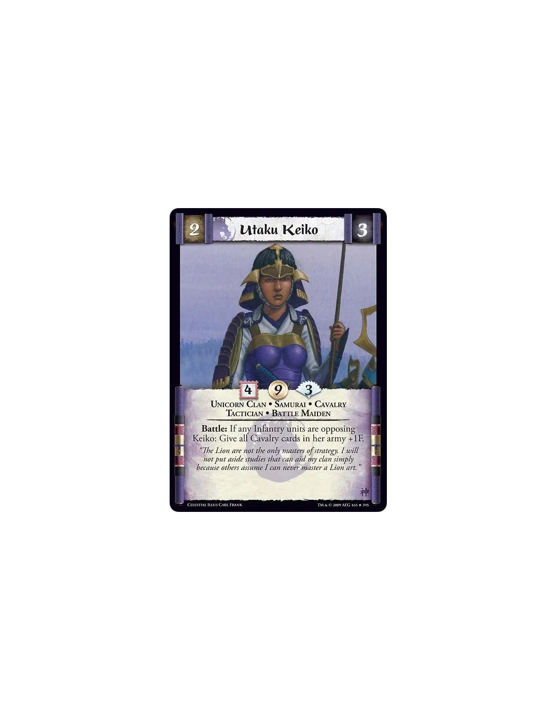 Unicorn Clan • Samurai • Cavalry • Tactician • Battle Maiden Battle: If any Infantry units are opposing Keiko: Give all Cavalry cards in her army +1F.