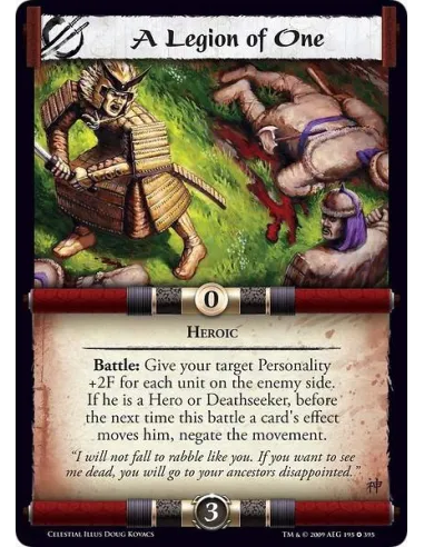 Heroic Battle: Give your target Personality +2F for each unit on the enemy side.If he is a Hero or Deathseeker, before the next time this battle a card's effect moves him, negate the movement.