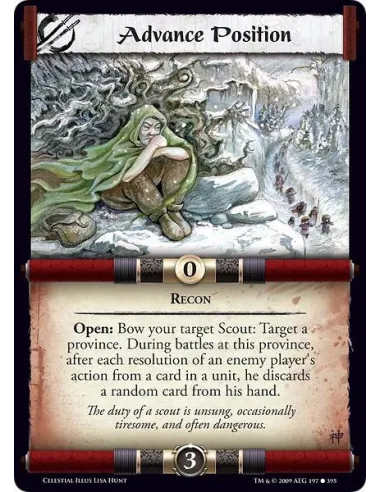 Recon Open: Bow your target Scout: Target a province. During battles at this province, after each resolution of an enemy player's action from a card in a unit, he discards a random card from his hand.