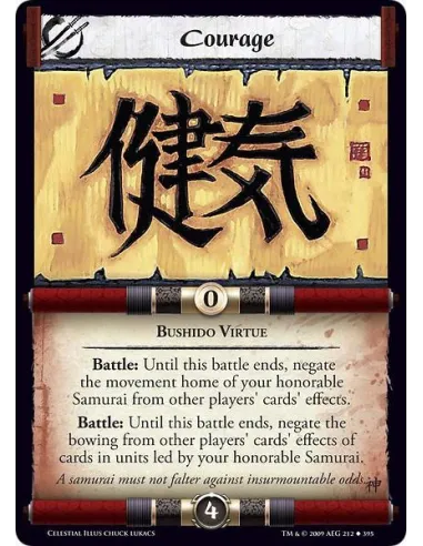 Bushido Virtue Battle: Until this battle ends, negate the movement home of your honorable Samurai from other players' cards' effects. Battle: Until this battle ends, negate the bowing from other players' cards' effects of cards in units led by your honorable Samurai.