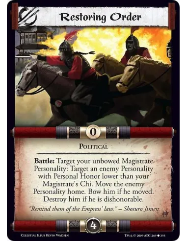 Political Battle: Target your unbowed Magistrate Personality: Target an enemy Personality with Personal Honor lower than your Magistrate's Chi. Move the enemy Personality home. Bow him if he moved. Destroy him if he is dishonorable.