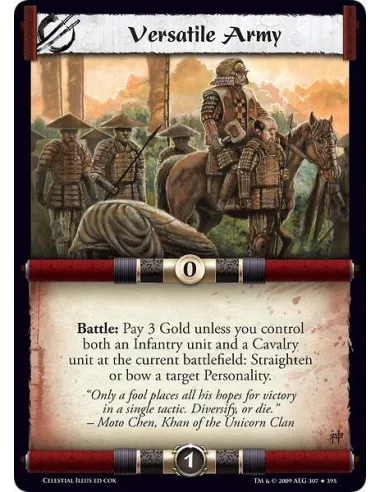Battle: Pay 3 Gold unless you control both an Infantry unit and a Cavalry unit at the current battlefield: Straighten or bow a target Personality.