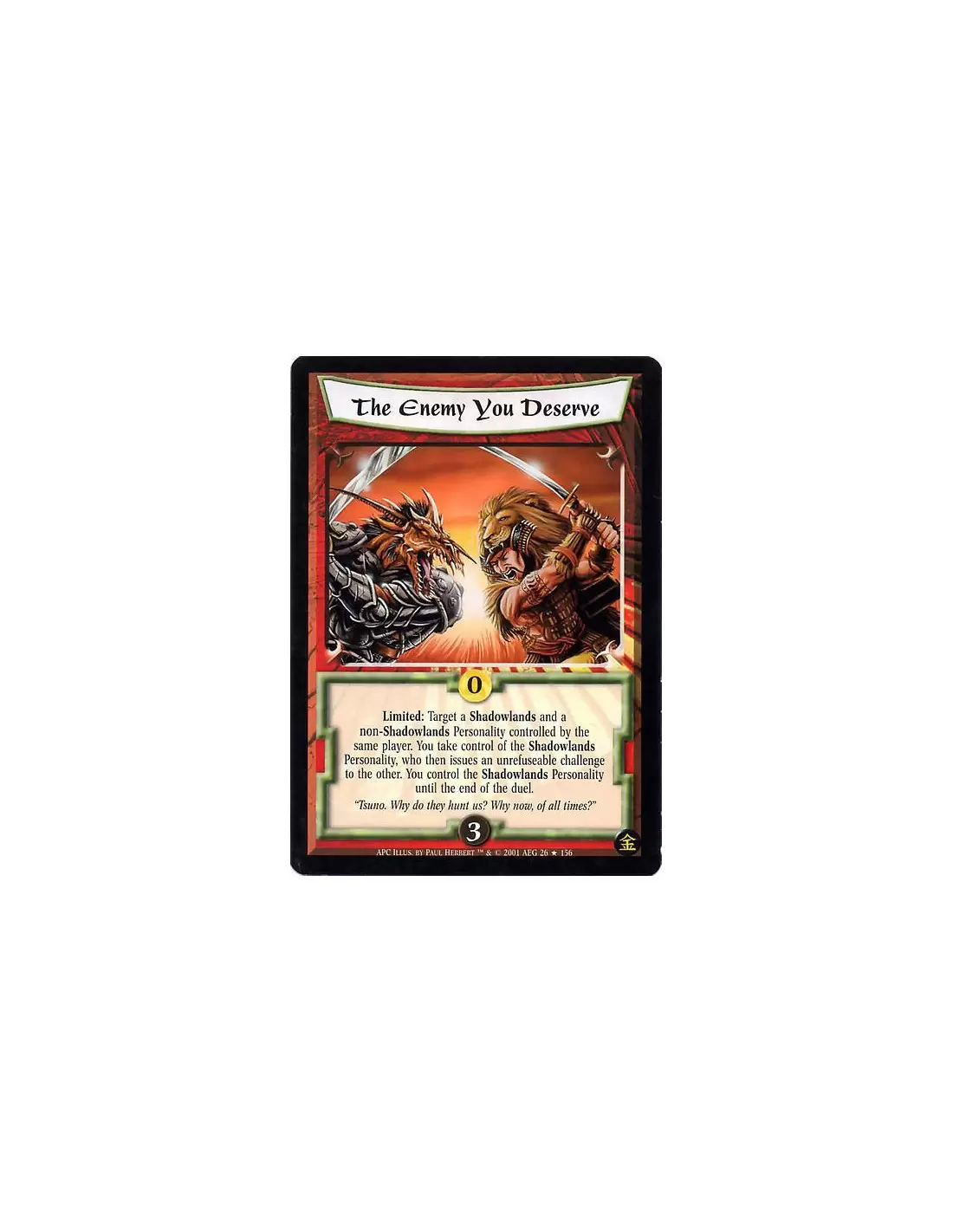 Limited: Target a Shadowlands and a non-Shadowlands Personality controlled by the same player. You take control of the Shadowlands Personality, who then issues an unrefusable challenge to the other. You control the Shadowlands Personality until the end of the duel.