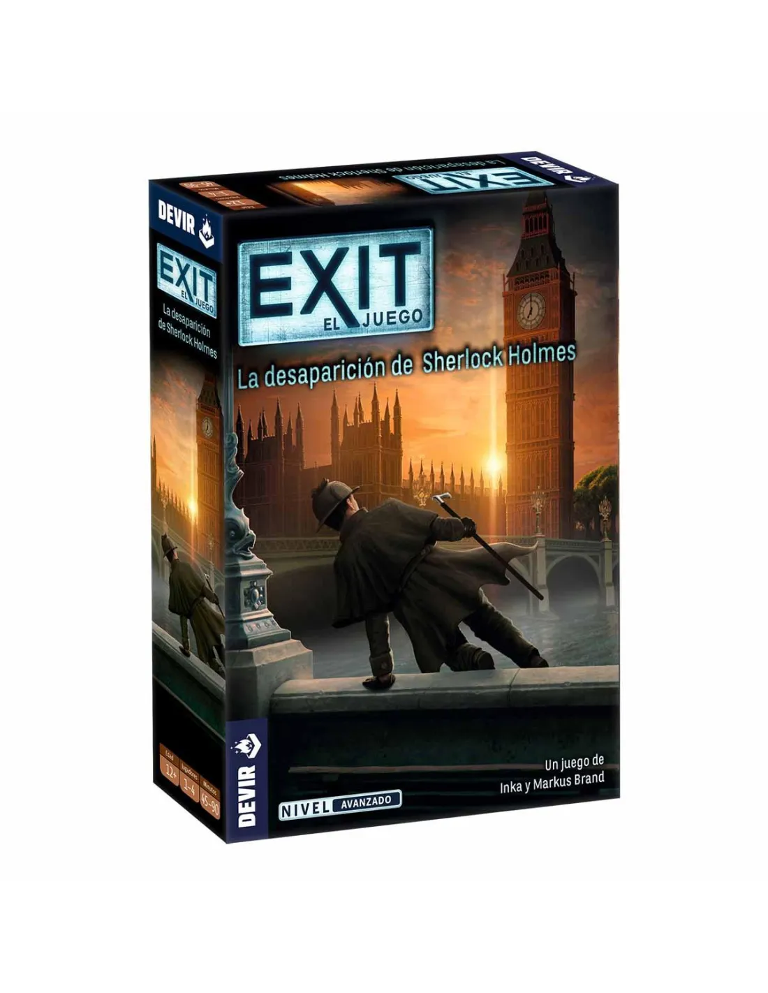 Exit: La desaparición de Sherlock Holmes es un juego de escape cooperativo diseñado por Inka y Markus Brand, que se puede disfrutar en solitario o en un grupo de hasta 4 personas, a partir de 12 años, en partidas que pueden durar entre 60 y 120 minutos. A través de 88 cartas, varios documentos, un descodificador y algunos artefactos especiales, los jugadores podrán explorar e interactuar con el entorno y todo lo que vayan encontrando para tratar de descubrir qué ha pasado con el detective más famoso de todos los tiempos.