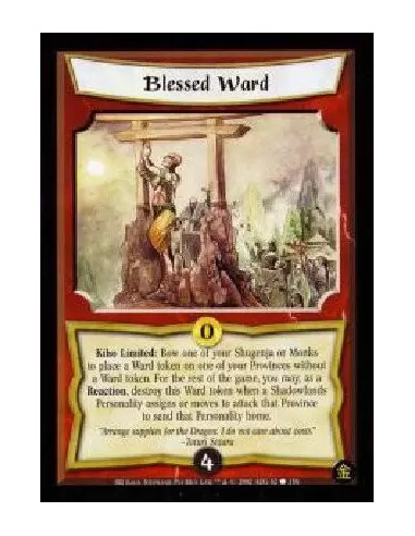 Kiho Limited: Bow one of your Shugenja or Monks to place a Ward token on one of your Provinces without a Ward token. For the rest of the game, you may, as a Reaction, destroy this Ward token when a Shadowlands Personality assigns or moves to attack that Province to send that Personality home.