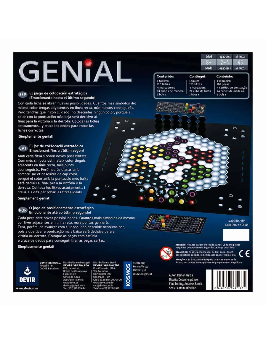 Genial es un juego de tablero imaginativo, de reglas sencillas y fácil aprendizaje. Genial es un increíble desafío intelectual que es capaz de enganchar a todos los públicos. Este ingenioso juego creado por el renombrado diseñador Reiner Knizia, ha sido nominado al prestigioso premio alemán Juego del Año 2004. Se trata de uno de los pocos juegos de tablero que ofrece la posibilidad de jugar en solitario.