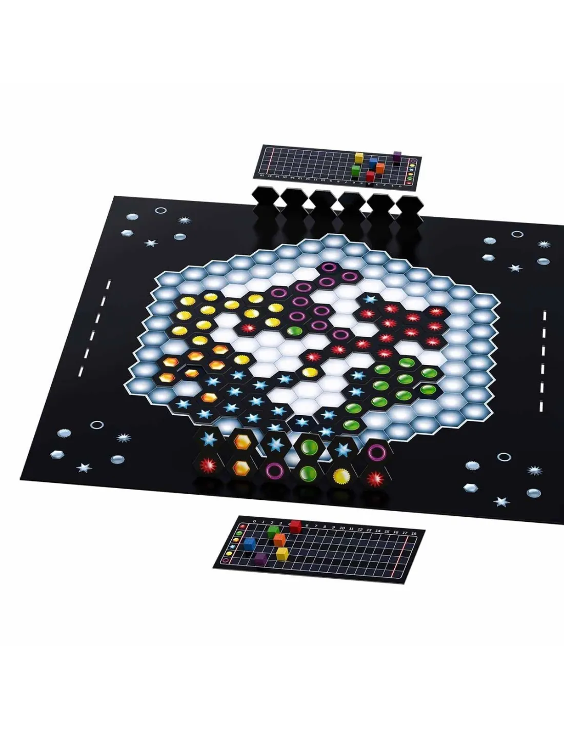 Genialmente simple y simplemente genial! El funcionamiento del juego es tan sencillo como adictivo: el tablero, hexagonal, está formado por pequeños hexágonos que recuerdan la composición de una colmena. Cada jugador saca de una bolsita un número de fichas que mantiene ocultas. Las fichas, formadas por dos símbolos cada una (como el dominó), se van colocando en el tablero a elección de cada uno de los jugadores. Hay seis tipos de símbolos (cada uno tiene una forma distinta y un color diferente, para ser fácilmente reconocibles), luego hay fichas con todo tipo de combinaciones. Y el juego consiste en ir combinando las fichas en el tablero (de nuevo como el dominó) para ir consiguiendo puntos y, al mismo tiempo, ir evitando que los rivales puedan conseguir grandes combos de puntuación.