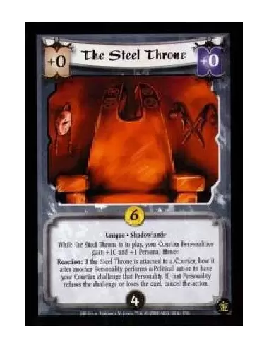 Unique. Shadowlands While the Steel Throne is in play, your Courtier Personalities gain +1C and +1 Personal Honor.Reaction: If the Steel Throne is attached to a Courtier, bow it after another Personality performs a Political action to have your Courtier challenge that Personality. If that Personality refuses the challenge or loses the duel, cancel the action.