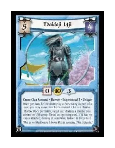 Crane Clan Samurai · Harrier · Experienced 3 · Unique. Once per turn, before destroying a Personality as part of a cost, you may move him home instead if he is a Harrier. Battle: Once per battle, target and destroy a Harrier you control in Uji's army: Target an opposing card. If it has no cards attached, destroy it; otherwise, reduce its Force to 0.