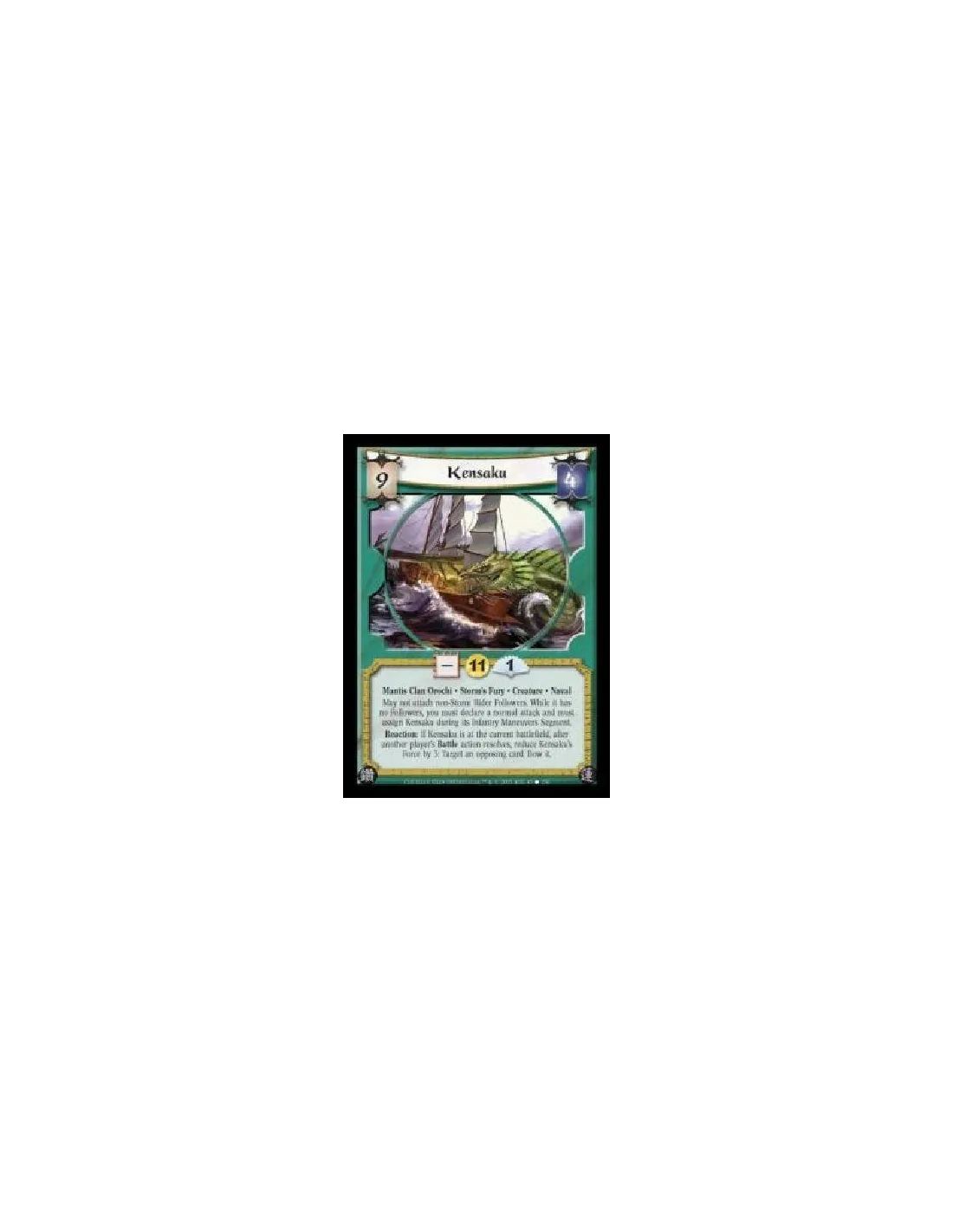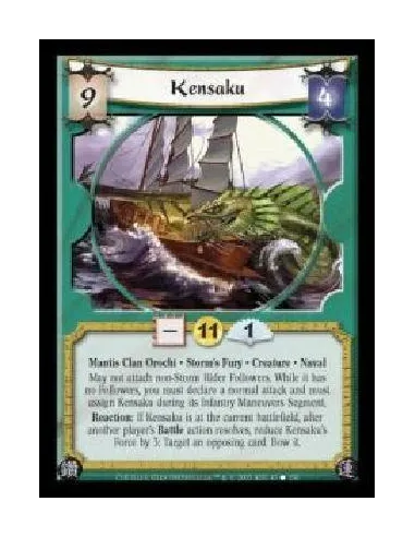 Mantis Clan Orochi · Storm's Fury · Creature · Naval. May not attach non-Storm Rider Followers. While it has no Followers, you must declare a normal attack and must assign Kensaku during its Infantry Maneuvers Segment. Reaction: If Kensaku is at the current battlefield, after another player's Battle action resolves, reduce Kensaku's Force by 3: Target an opposing card. Bow it.