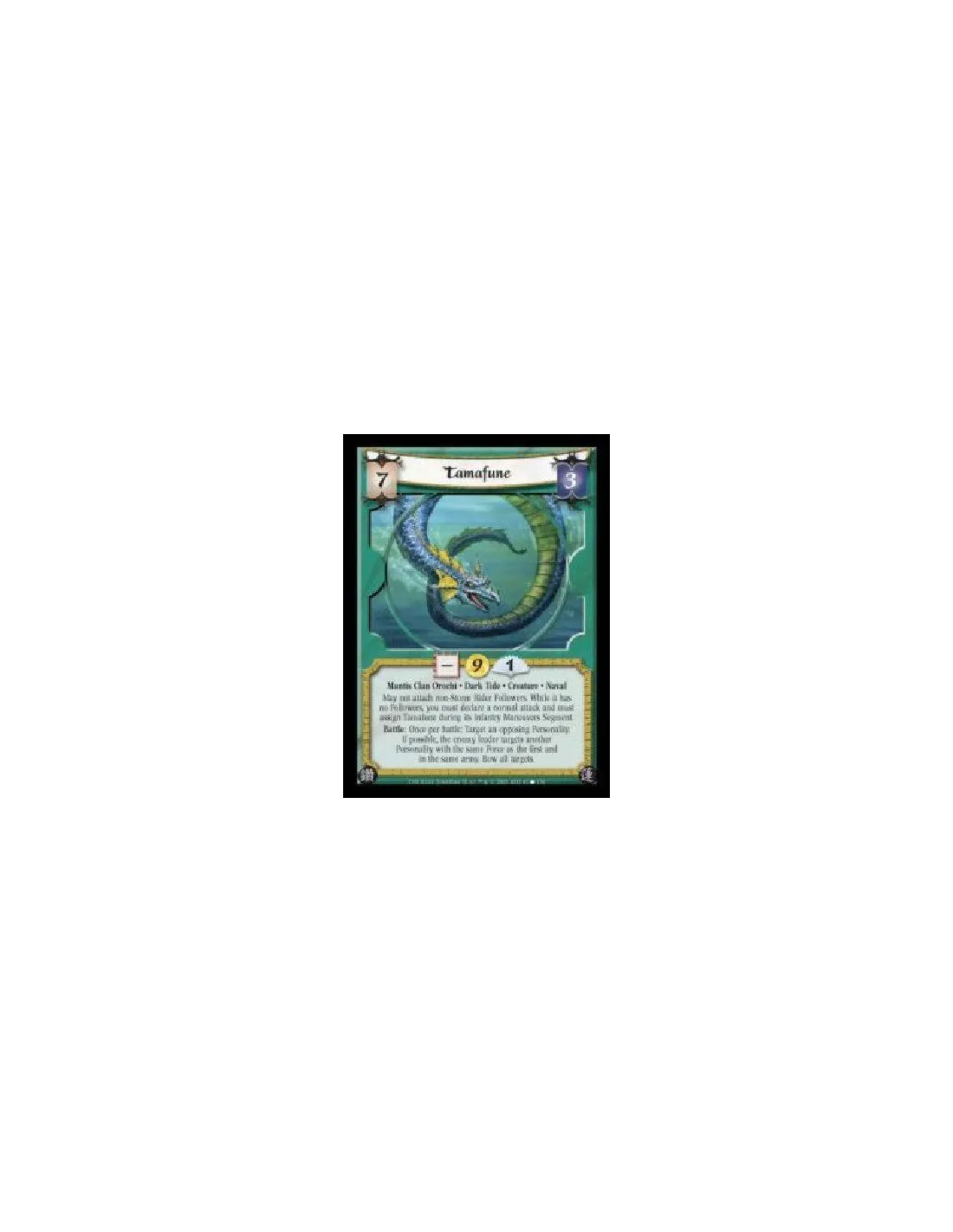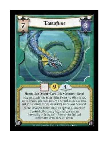 Mantis Clan Orochi · Dark Tide · Creature · Naval. May not attach non-Storm Rider Followers. While it has no Followers, you must declare a normal attack and must assign Tamafune during its Infantry Maneuvers Segment. Battle: Once per battle: Target an opposing Personality. If possible, the enemy leader targets another Personality with the same Force as the first and in the same army. Bow all targets