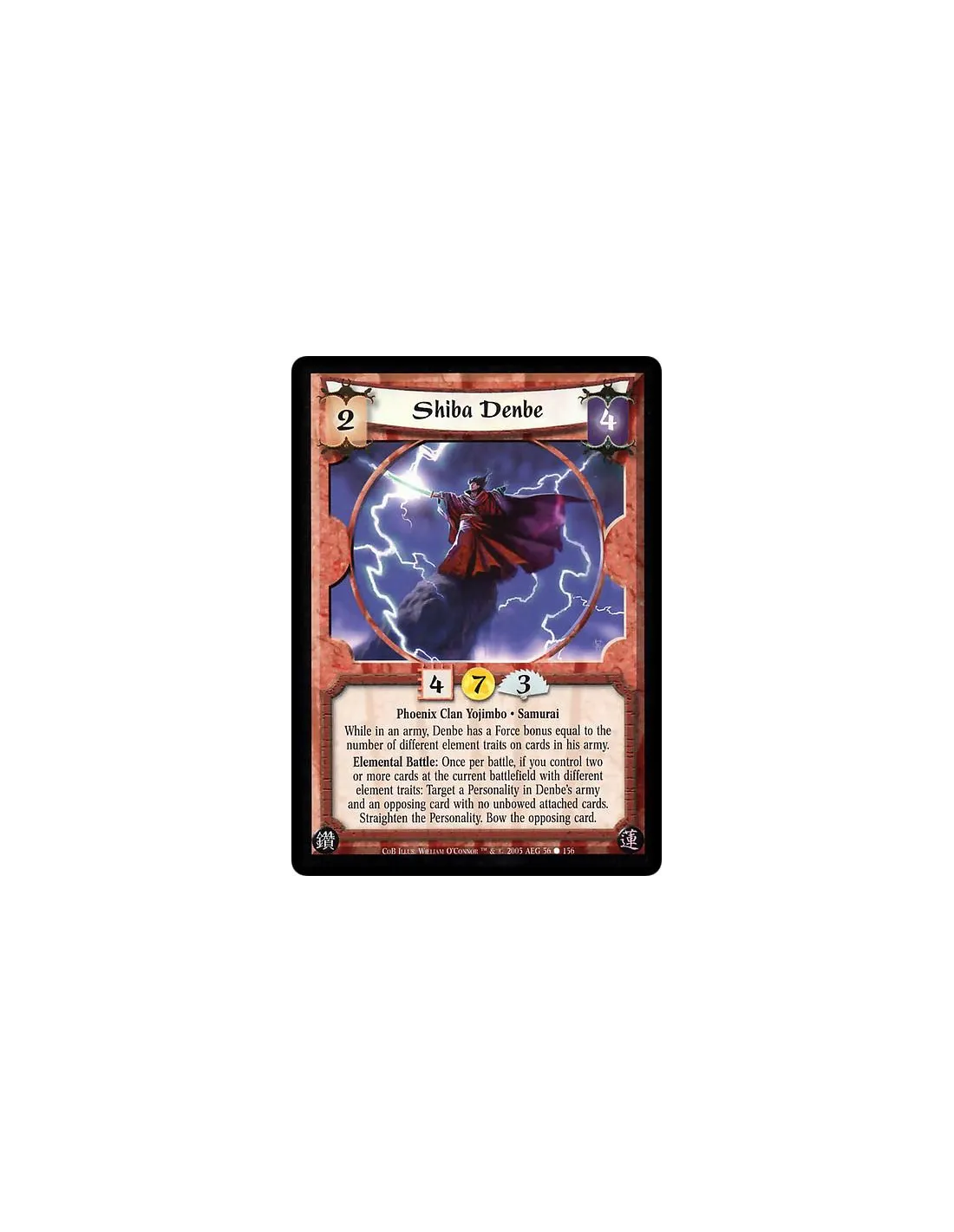 Phoenix Clan Yojimbo · Samurai. While in an army, Denbe has a Force bonus equal to the number of different element traits on cards in his army. Elemental Battle: Once per battle, if you control two or more cards at the current battlefield with different element traits: Target a Personality in Denbe's army and an opposing card with no unbowed attached cards. Straighten the Personality. Bow the opposing card