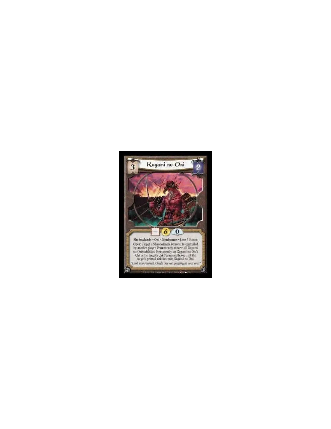 Shadowlands · Oni · Nonhuman · Lose 3 Honor. Open: Target a Shadowlands Personality controlled by another player. Permanently remove all Kagami no Oni's abilities. Permanently set Kagami no Oni's Chi to the target's Chi. Permanently copy all the target's printed abilities onto Kagami no Oni