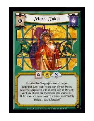 Mantis Clan Shugenja. Seer. Unique Reaction: Bow Jukio before one of your Events resolves to replace it with another face-up Dynasty card and shuffle the Event back into your deck.If the new card is an Event, it resolves immediately.?Wakiza? had a daughter??