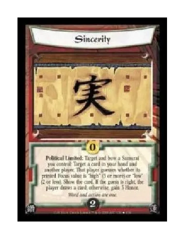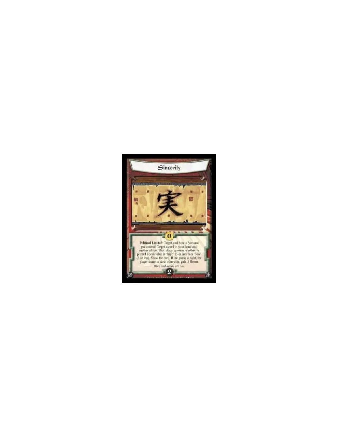 Political Limited: Target and bow a Samurai you control: Target a card in your hand and another player. That player guesses whether its printed Focus value is ?high? (3 or more) or ?low? (2 or less). Show the card. If the guess is right, the player draws a card; otherwise, gain 3 Honor.