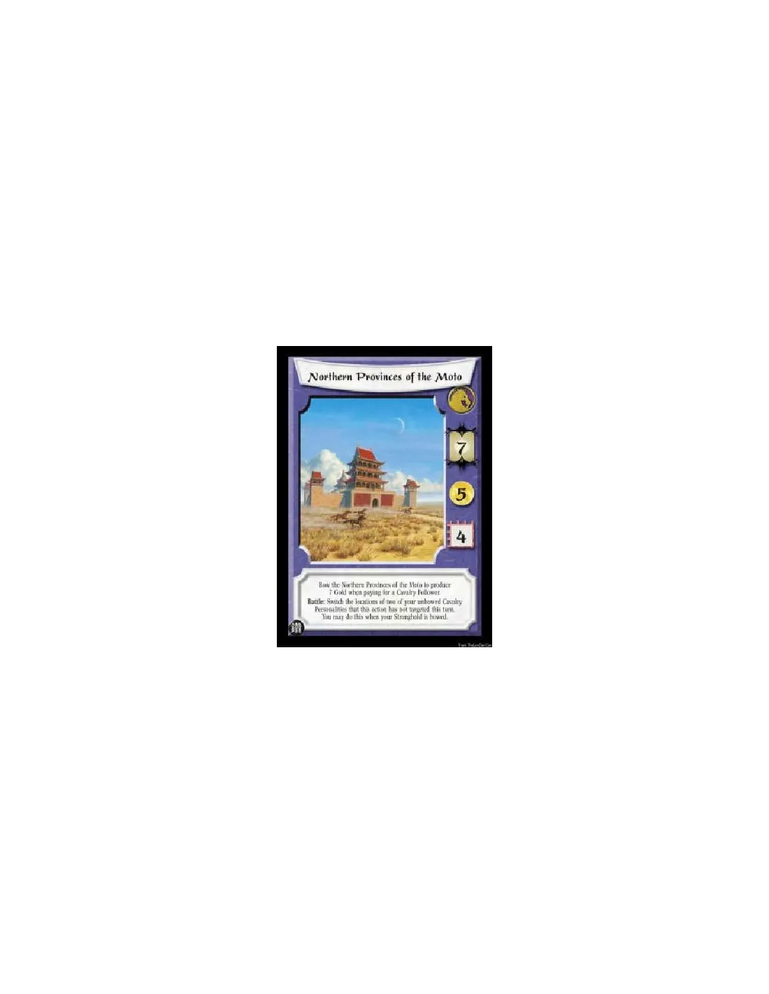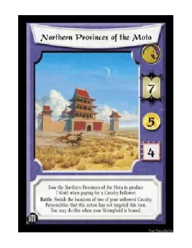 Bow the Northern Provinces of the Moto to produce 7 Gold when paying for a Cavalry Follower. Battle: Switch the locations of two of your unbowed Cavalry Personalities that this action has not targeted this turn. You may do this when your Stronghold is bowed.