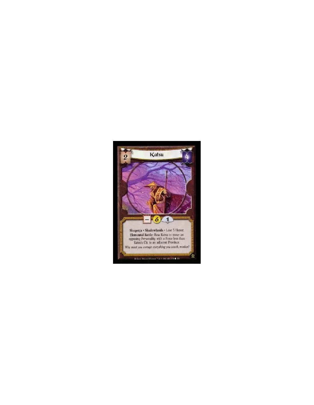 Shugenja. Shadowlands Lose 3 Honor. Elemental Battle: Bow Katsu to move an opposing Personality with a Force less than Katsu's Chi to an adjacent Province.
