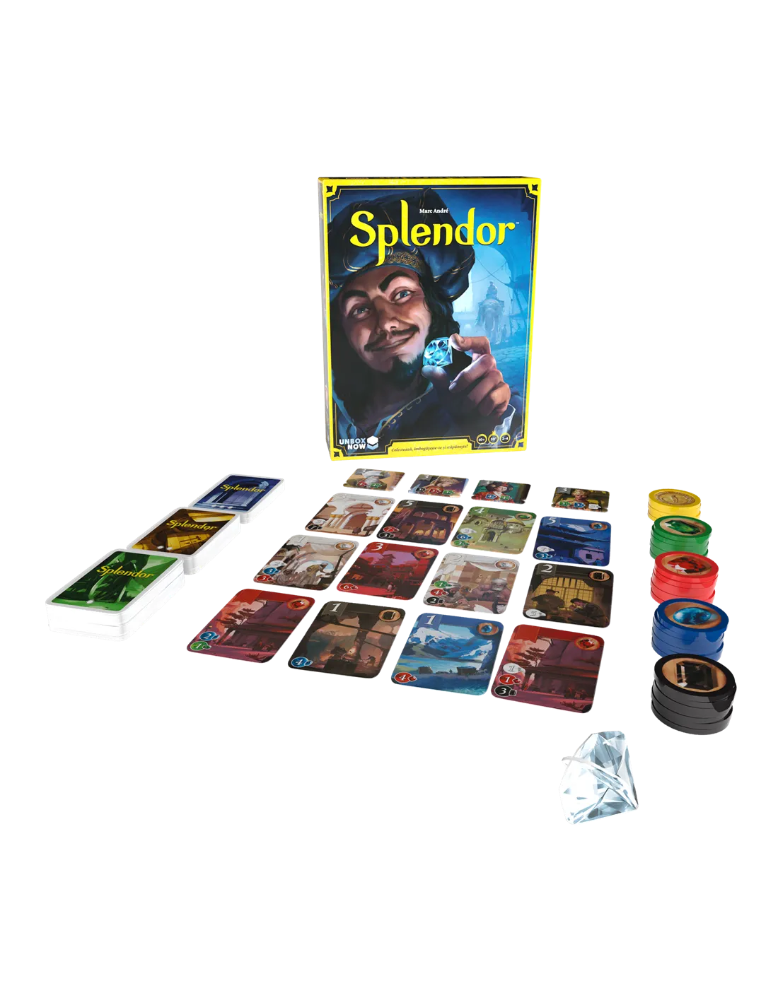 1 folleto de reglas, 1 marcador de Jugador inicial, 40 fichas de póquer personalizadas, 90 cartas de desarrollo, 10 losetas de noble