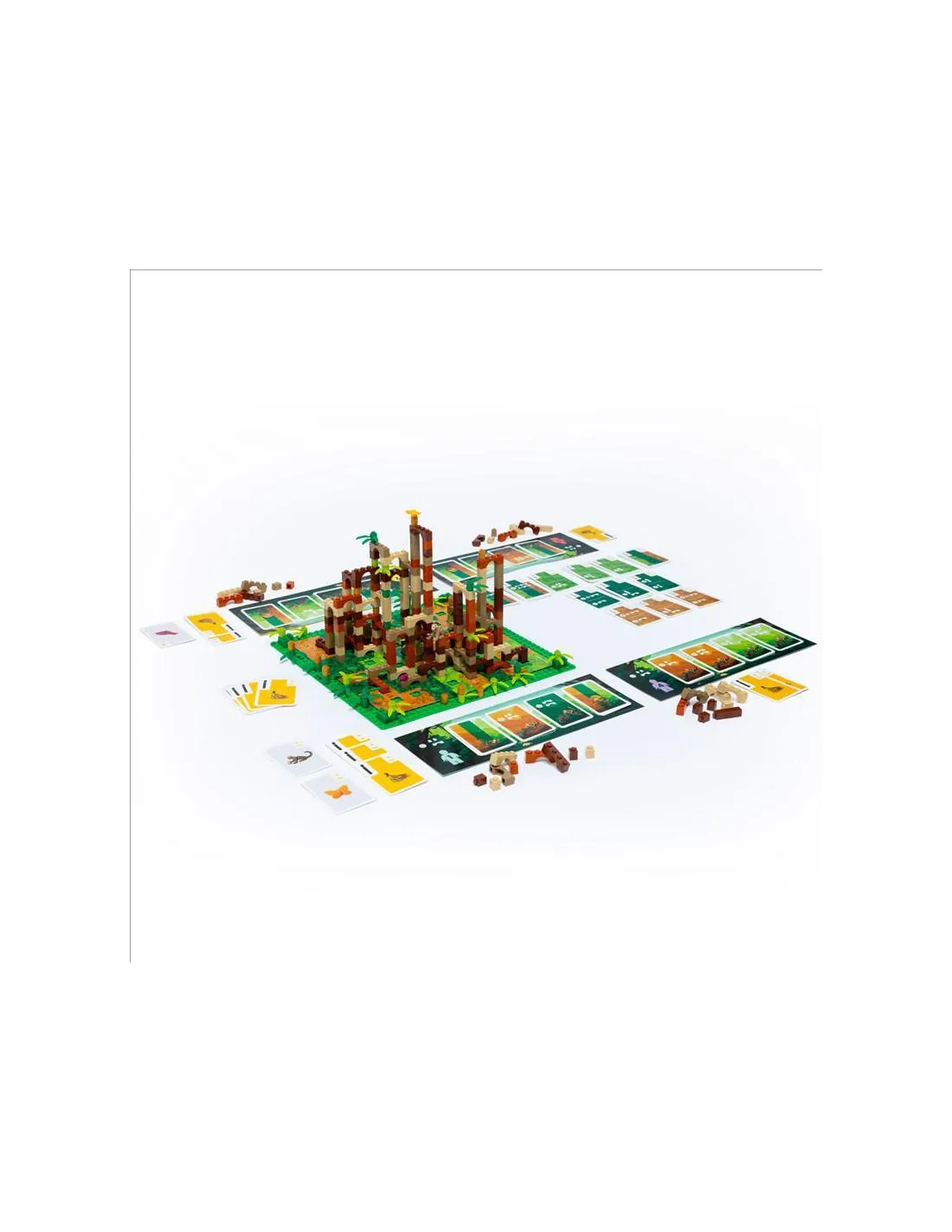 Piezas de construcción (80 Arcos, 80 Ladrillos, 16 Columnas), Piezas decorativas (32 Hojas de bambú y 16 Ladrillos decorados), Animales (1 Mono, 1 Mariposa, 1 Rana), Otros (4 Esquinas y 1 Base), Cartas (67 cartas de mono, 14 cartas de Bonificación, 3 cartas de Trofeo), Otros componentes (4 tableros personales, 1 bandeja de piezas y 2 Mapas de terreno de doble cara)