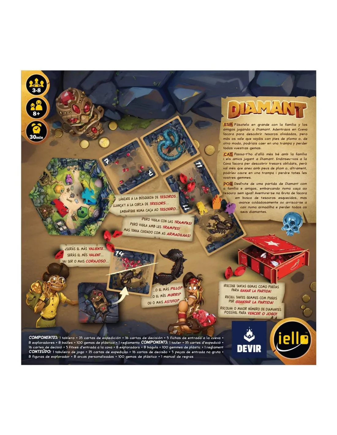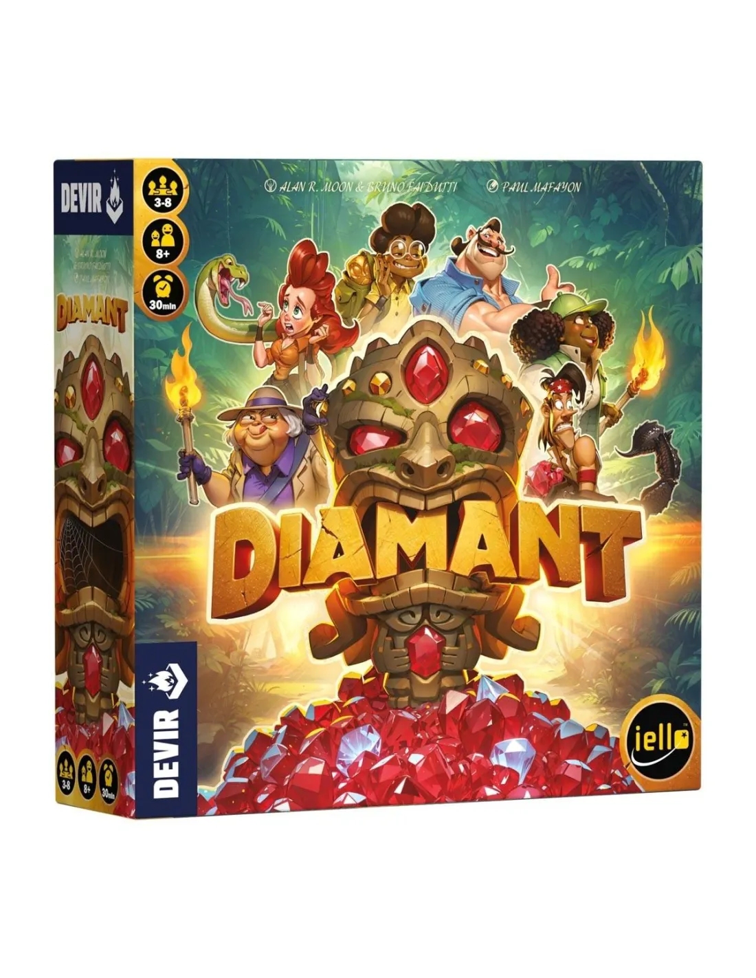 Diamant - Nueva Edición es un juego de mesa con mecánicas “tentar a la suerte” creado por Bruno Faidutti y Alan R. Moon, en el que deberemos representar a exploradores que desean quedarse con la mayor cantidad de diamantes posible. Para conseguirlo deberán, en todos los turnos, tomar la sabia decisión de si avanzan en su viaje o si se detienen antes de perecer. Las risas están más que aseguradas.
