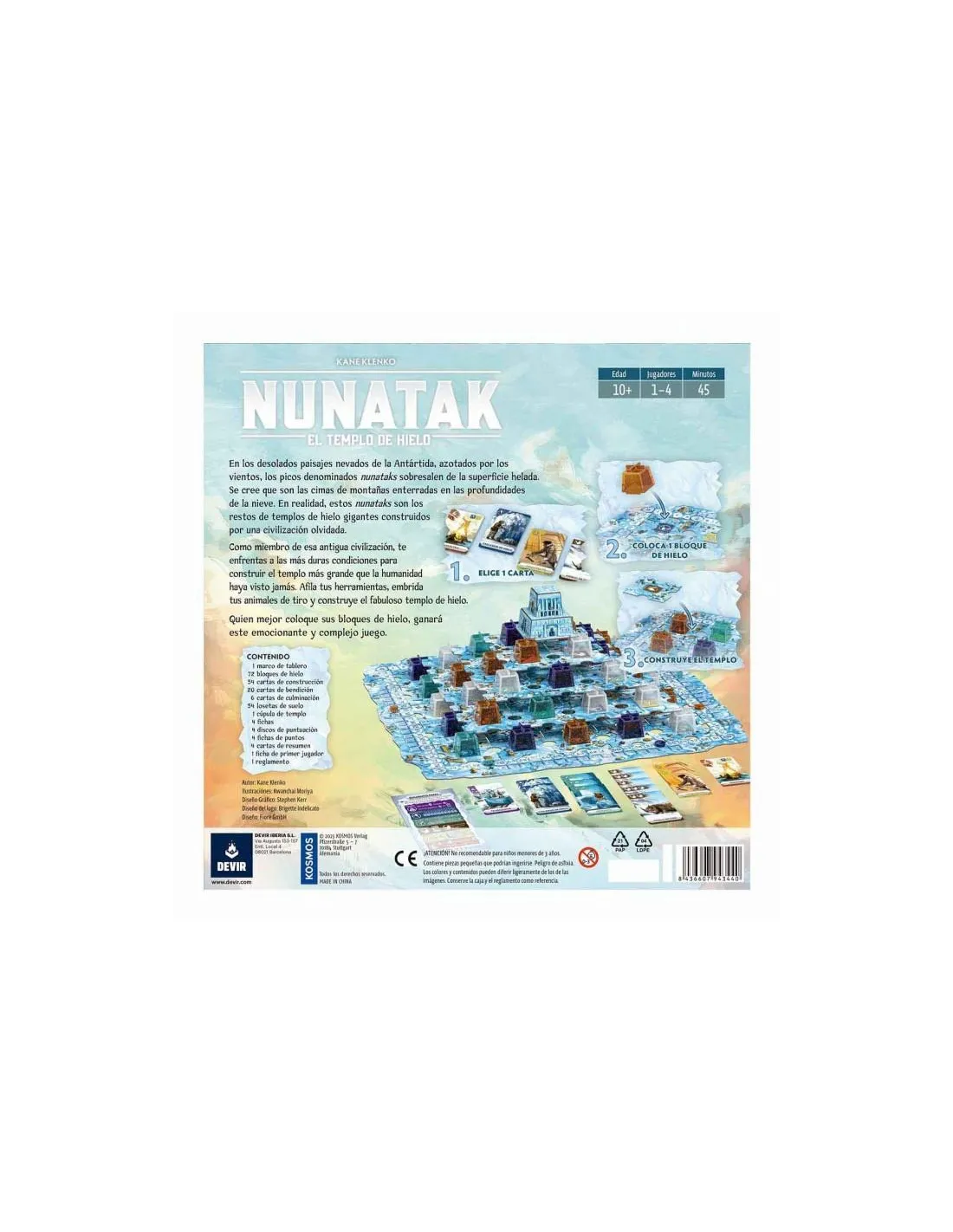 Diseñado por Kane Klenko, se puede disfrutar en solitario o en grupos de hasta 4 jugadores, a partir de 10 años. Los jugadores irán creando secciones del templo con bloques de hielo, que les proporcionarán puntos durante la partida. En el recuento final, también se sumarán más puntos a través de las cartas que se consigan durante la partida. El ganador será quien acumule más puntos.