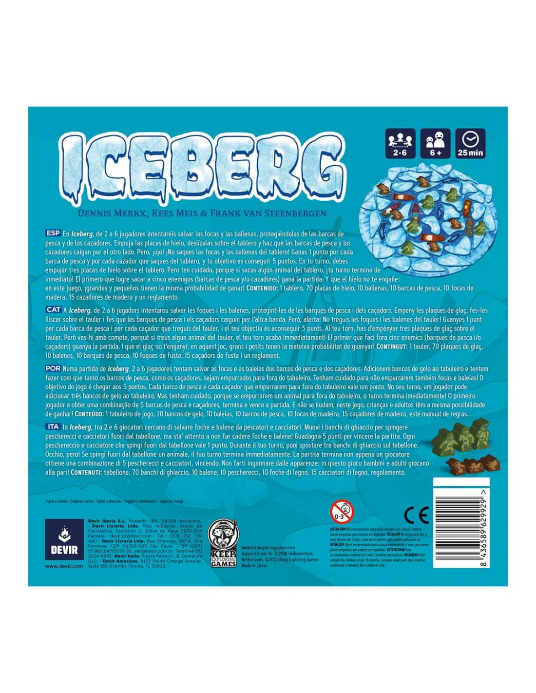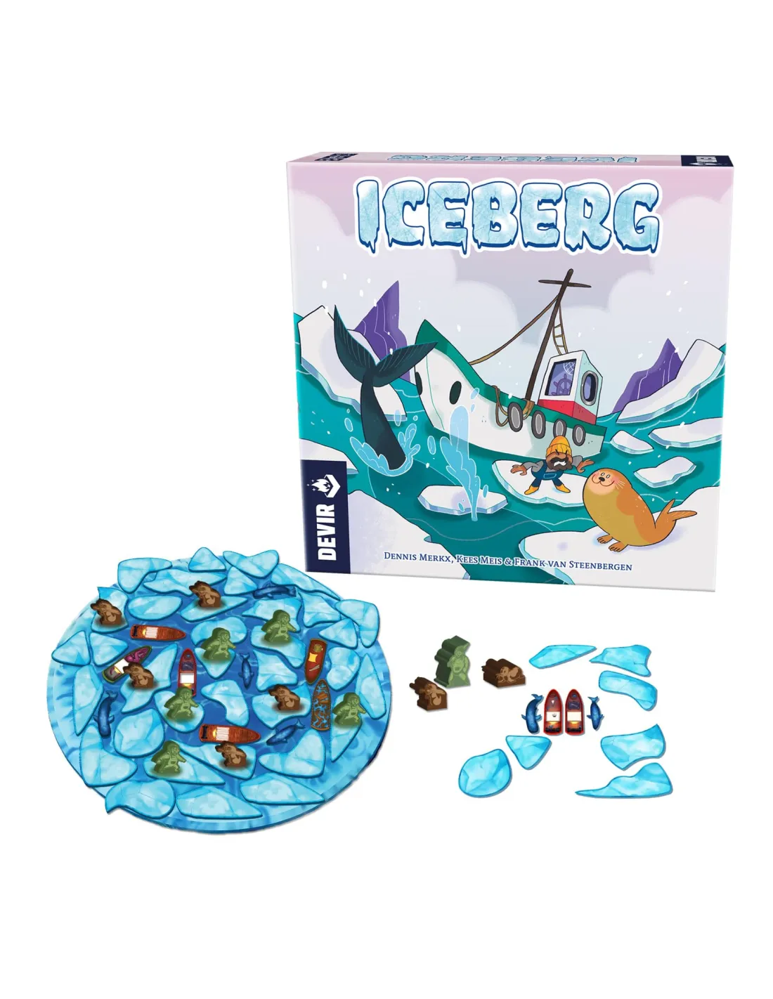 ¡Las focas y las ballenas necesitan tu ayuda! En Iceberg deberás deslizar piezas de cartón que simbolizan bloques de hielo para sacar del tablero a los malvados cazadores y sus barcos de pesca. Pero ¡ojo! Cuidado con tirar las focas y las ballenas del tablero, porque el turno termina de inmediato. Y que el hielo no os engañe: en este juego, ¡grandes y pequeños tienen la misma probabilidad de ganar!