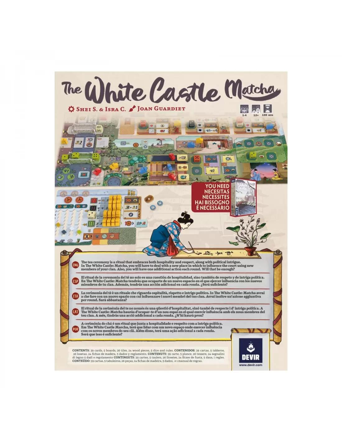 ¡Expande The White Castle con un nuevo tablero y más acciones a tu alcance! Matcha incorpora un montón de componentes que darán variabilidad a tus partidas: un nuevo puente con sus propios dados, nuevos espacios donde conseguir influencia y obtener recursos (la casa del té y el mirador del lago) nuevos miembros del clan (las geishas) y un recurso extra, el chasen. También dispondrás de un turno extra para tratar de conseguir el máximo número de puntos de influencia. ¿Preparado para volver al castillo de Himeji y dominar las sutilezas de la ceremonia del té?