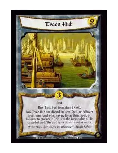 Port Bow Trade Hub and discard an item, Spell, or Follower from your hand when paying for an Item, Spell, or Follower to produce 2 Gold plus the Focus value of the discarded card. The card types do not need to match.
