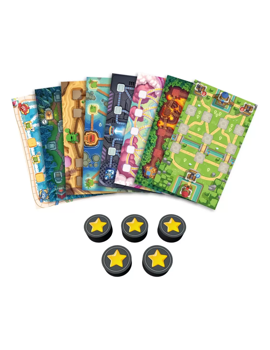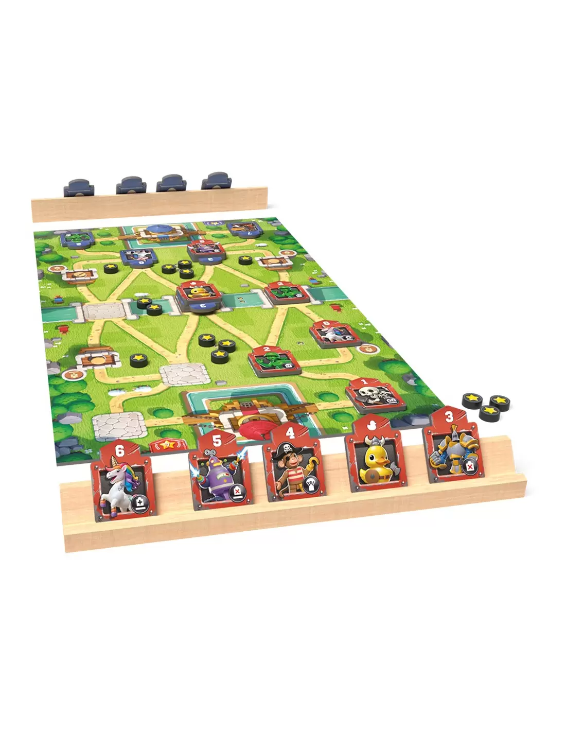 48 Tropas, 4 tableros (8 Terrenos), 16 Medallas, 2 soportes, 2 cajas de almacenaje y 1 ayuda