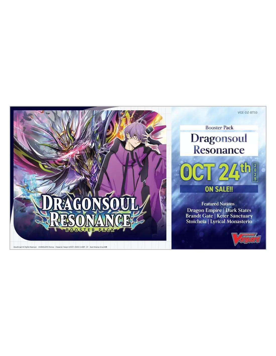 Includes unit cards from all 6 nations that will feature in the TV animation "CARDFIGHT!! VANGUARD Divinez DELUXE Finals" that streams from July 2025! In "Dragonsoul Resonance", Michiru Hazama takes center stage with his unit "Demonic Jewel Dragon Emperor, Drajeweled Magnus"!