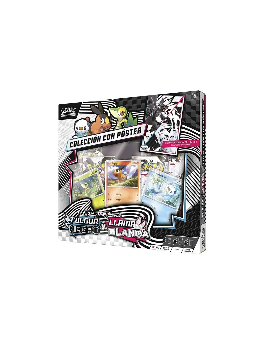 ¡Con 156 Pokémon por descubrir, Teselia es una región repleta de oportunidades para los Entrenadores Pokémon! Completa tu Pokédex regional con los primeros compañeros Snivy, Tepig y Oshawott en forma de cartas holográficas de promoción, y busca más Pokémon de Teselia en los cuatro sobres de mejora (dos de cada expansión) de las expansiones especiales Escarlata y Púrpura-Fulgor Negro y Escarlata y Púrpura-Llama Blanca que hallarás en el interior. También conseguirás un póster impreso por ambas caras con el que celebrar la llegada de ambas expansiones.