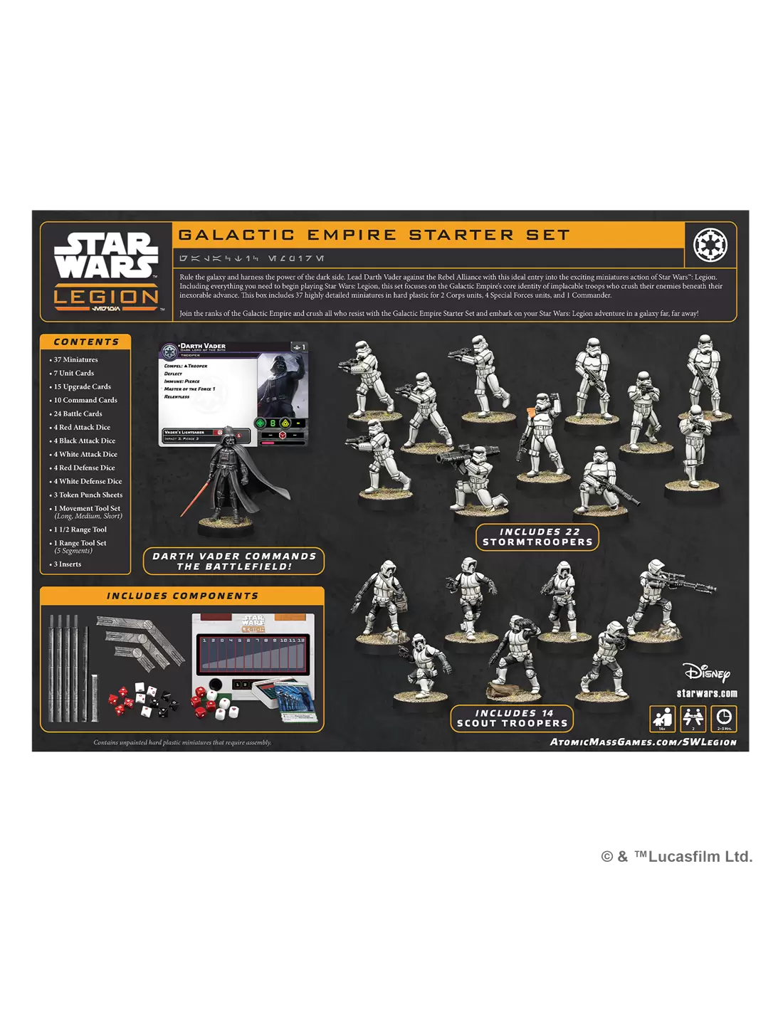 Gobierna la galaxia con puño de hierro y domina el poder del Lado Oscuro. Enfrenta a Darth Vader contra la Alianza Rebelde con esta introducción ideal al emocionante juego de miniaturas de Star Wars™: Legión. Esta caja contiene todo lo necesario para empezar a jugar a Star Wars™: Legión con la facción del Imperio Galáctico y sus mecánicas básicas, con tropas implacables que arrollan al enemigo bajo su inexorable avance. Se incluyen 37 miniaturas de plástico esculpidas con todo lujo de detalle para desplegar 2 unidades de Tropa, 4 unidades de Fuerzas especiales y 1 Comandante.