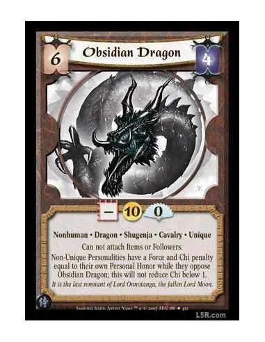 Nonhuman · Dragon · Shugenja · Cavalry · Unique. Can not attach Items or Followers. Non-Unique Personalities have a Force and Chi penalty equal to their own Personal Honor while they oppose Obsidian Dragon; this will not reduce Chi below 1.
