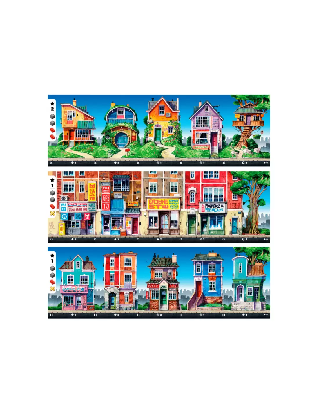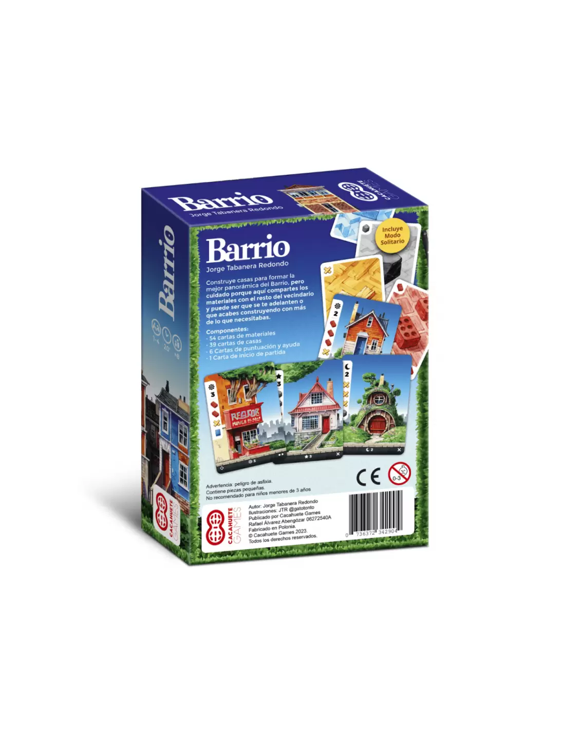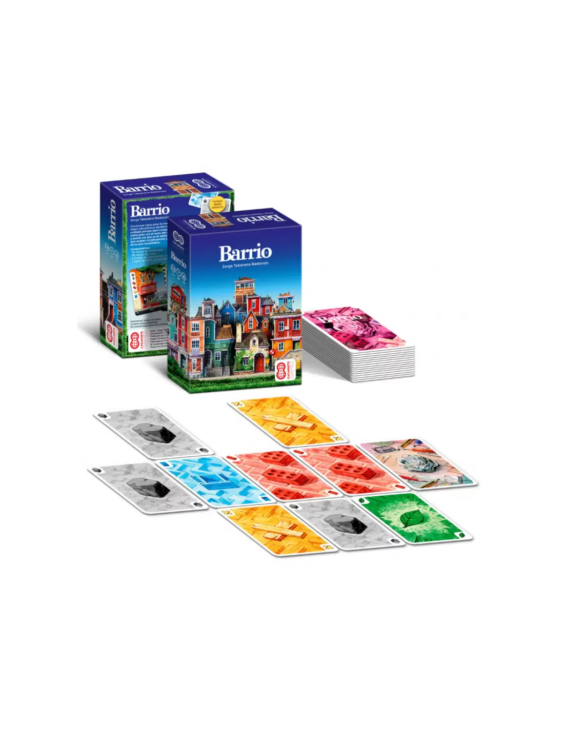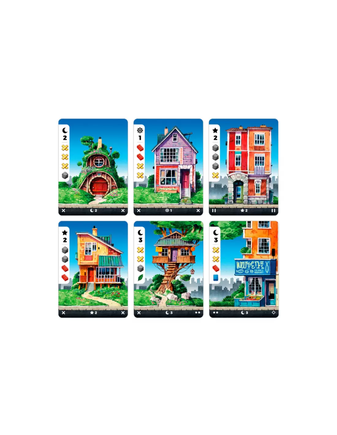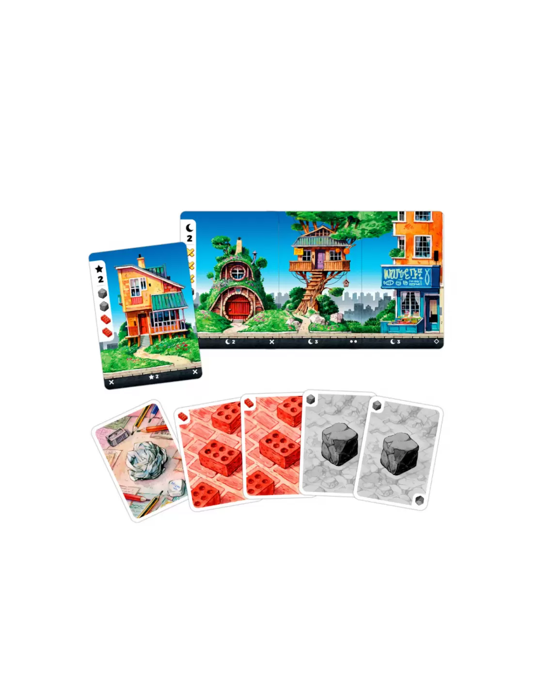 Componentes: 1 reglamento, 54 cartas de materiales, 39 cartas de casas y 6 cartas de puntuación/ayuda.
