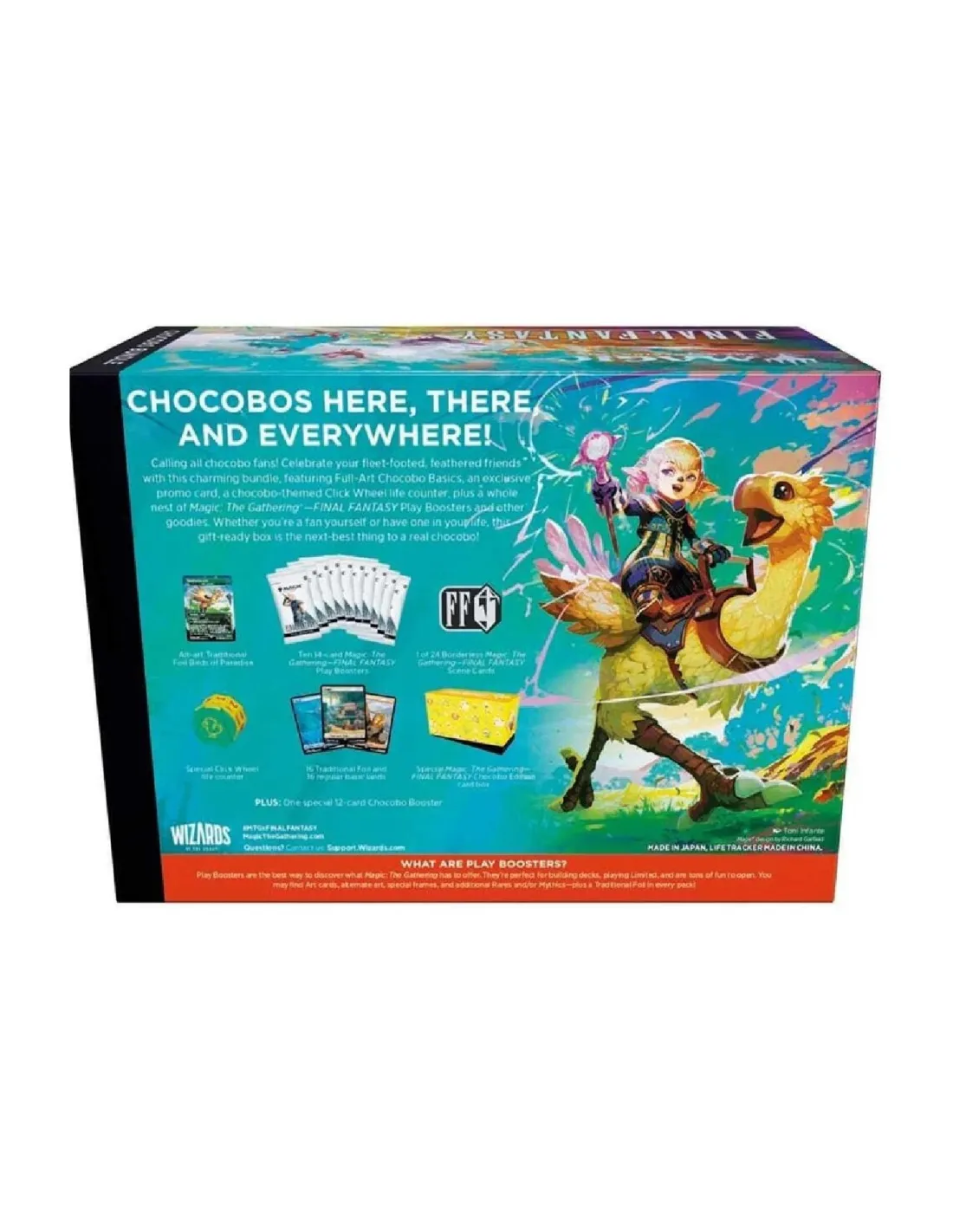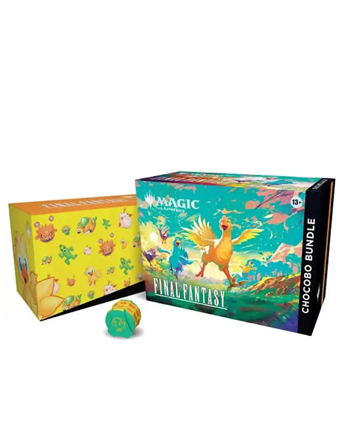 Calling all chocobo fans! Celebrate your fleet-footed, feathered friends with this charming bundle, featuring Full-Art Chocobo Basics, an exclusive promo card, a chocobo-themed Click Wheel life counter, plus a whole nest of Magic: The Gathering-FINAL FANTASY Play Boosters and other goodies. Whether you’re a fan yourself or have one in your life, this gift-ready box is the next-best thing to a real chocobo! This Chocobo Bundle contains 10 Magic: The Gathering-FINAL FANTASY Play Boosters, a 12-card Chocobo Booster, 1 Traditional Foil alt-art promo card, 1 of 24 Borderless Magic: The Gathering-FINAL FANTASY Scene Cards, 32 FINAL FANTASY Landmark Full-Art Basic Lands (16 Traditional Foil, 16 regular), a special Click Wheel life counter, and a Chocobo Edition card box. The Chocobo Booster contains 10 Full-Art Chocobo Basic Land cards and 2 Borderless Chocobo Bundle cards of rarity Rare or higher. This product does not contain a Golden Chocobo card (available in English-language Collector Boosters only).