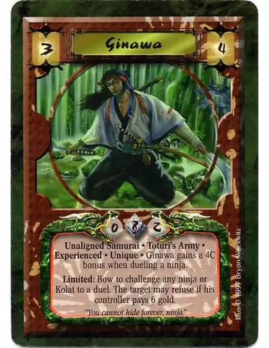 Unaligned Samurai. Toturi's Army. Experienced. Unique Ginawa gains a 4C bonus when dueling a ninja. Limited: Bow to challenge any ninja or Kolat to a duel. The target may refuse if his controller pays 6 gold.