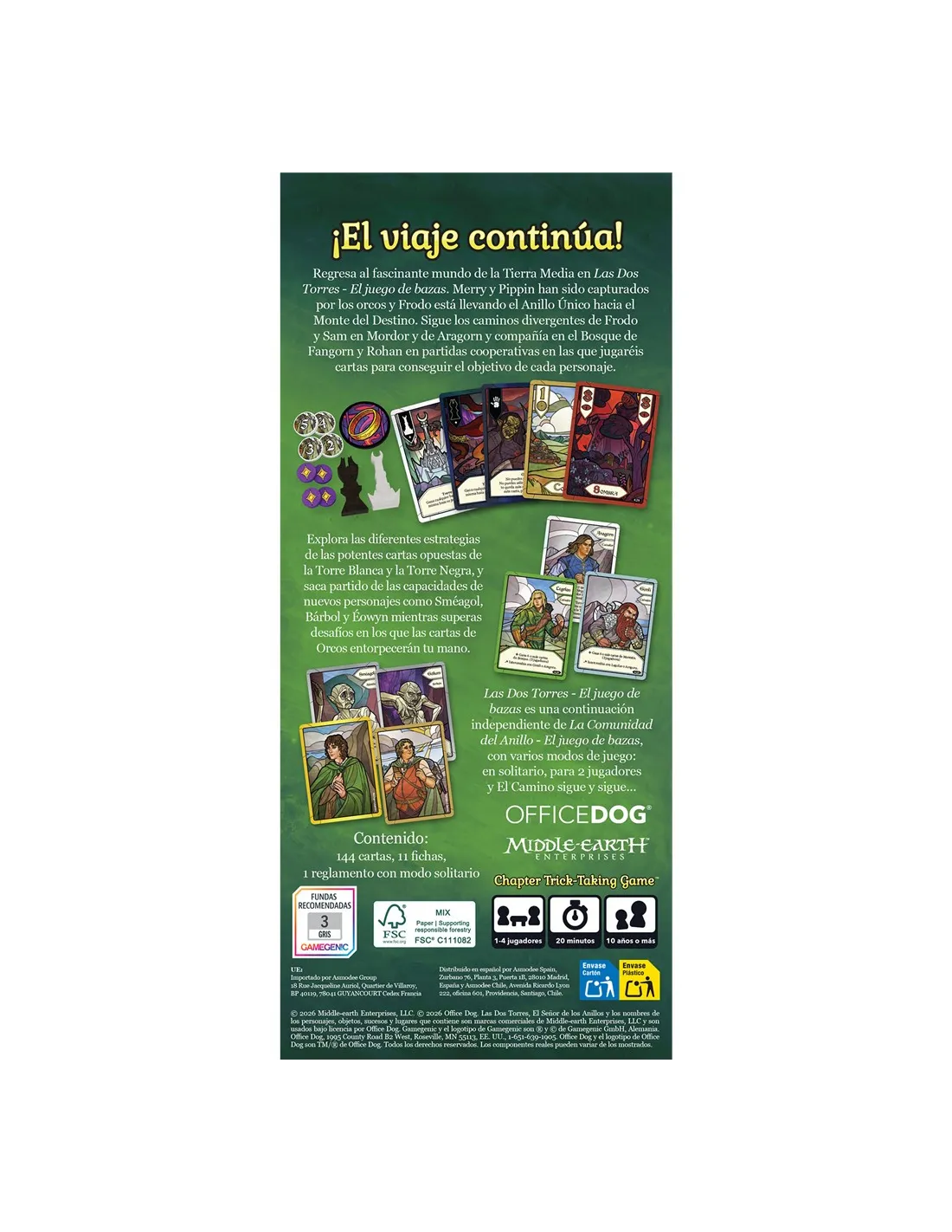 Regresa al fascinante mundo de la Tierra Media en Las Dos Torres - El juego de bazas. Merry y Pippin han sido capturados por los orcos y Frodo está llevando el Anillo Único hacia el Monte del Destino. Sigue los caminos divergentes de Frodo y Sam en Mordor y de Aragorn y compañía en el Bosque de Fangorn y Rohan en partidas cooperativas en las que jugaréis cartas para conseguir el objetivo de cada personaje.