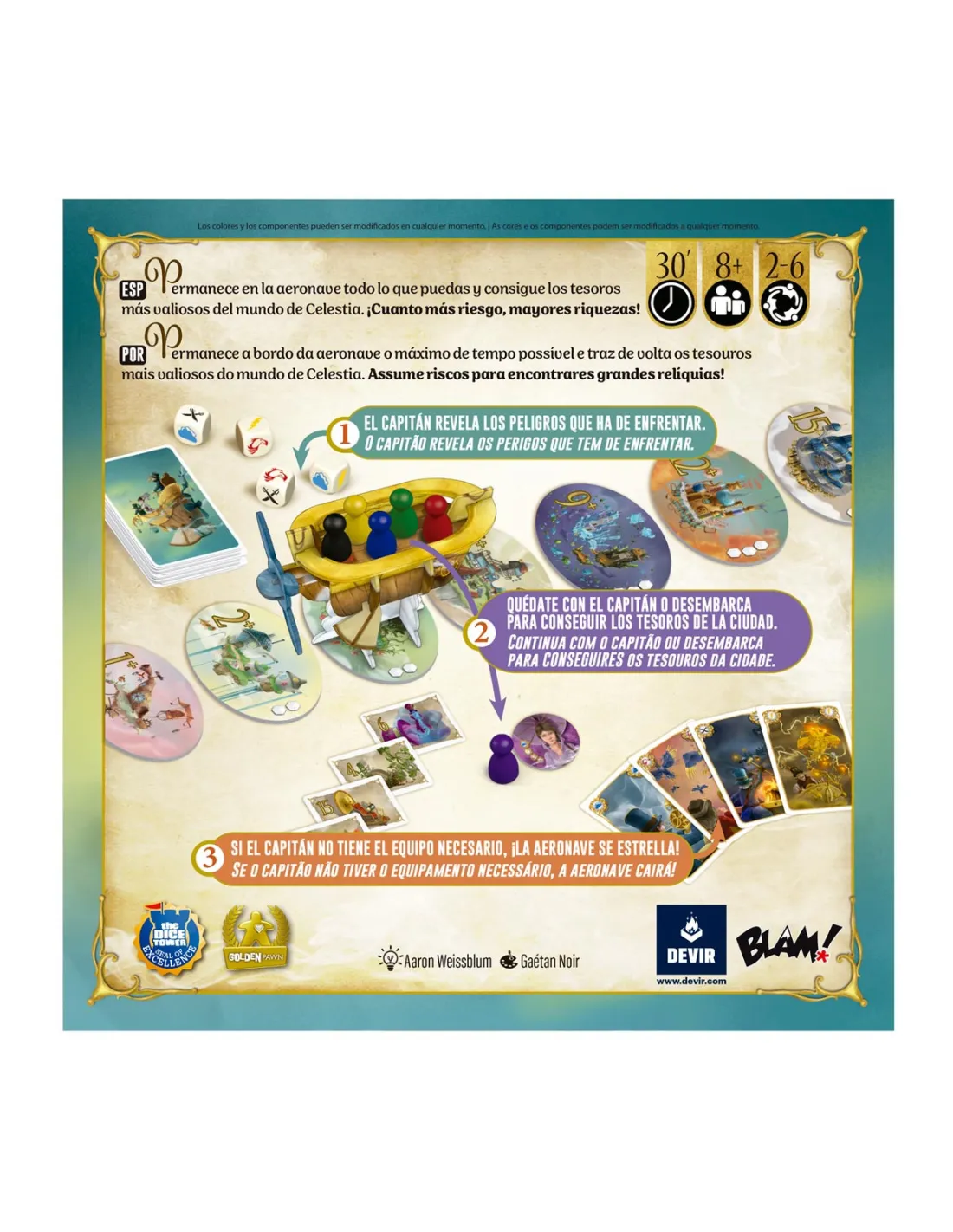 ¡Vuelve un clásico para toda la familia! En Celestia, los jugadores viajan en busca de tesoros a través de distintas ciudades. Sin embargo, deben decidir en qué momento bajan de la aeronave, pues cuanto más avanza, más posibilidades tiene de sufrir un accidente. Sin embargo, los tesoros de las ciudades más lejanas siempre son mejores… Permanece en la aeronave todo lo que puedas y consigue los tesoros más valiosos del mundo de Celestia. ¡Cuánto más riesgo, mayores riquezas!