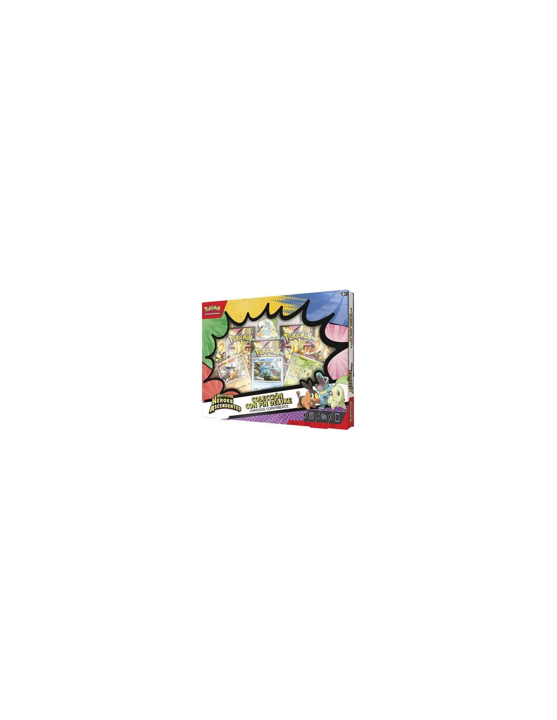 Toda nueva aventura comienza con un paso esencial: ¡elegir tu primer compañero Pokémon! En esta colección, podrás entablar amistad con el Pokémon de tipo Planta Chikorita, el de tipo Fuego Tepig y el de tipo Agua Totodile, que llegan en forma de impresionantes cartas holográficas de promoción y de un pin deluxe brillante y esmaltado donde aparecen los tres Pokémon juntos. Además, ¡conseguirás cinco sobres de mejora de la expansión Megaevolución-Héroes Ascendentes!
