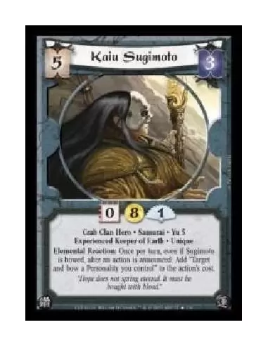 Crab Clan Hero · Samurai · Yu 5 · Experienced Keeper of Earth · Unique. Elemental Reaction: Once per turn, even if Sugimoto is bowed, after an action is announced: Add ?Target and bow a Personality you control? to the action's cost