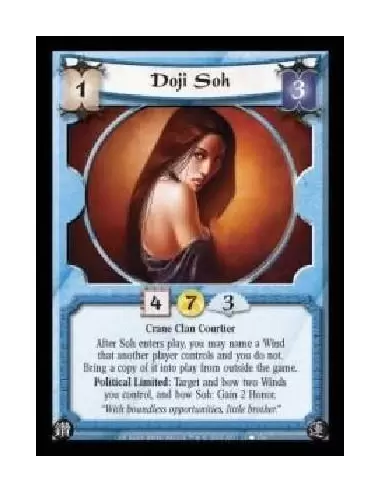 Crane Clan Courtier. After Soh enters play, you may name a Wind that another player controls and you do not. Bring a copy of it into play from outside the game. Political Limited: Target and bow two Winds you control, and bow Soh: Gain 2 Honor.