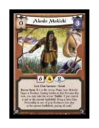 Lion Clan Samurai · Scout. Recon Open: If it is the Action Phase, bow Mokichi: Target a Province. During battles at that Province this turn, you may take the action ?Battle: If you control a unit at the current battlefield: Bring a Lion Clan Personality in one of your Provinces into play at the current battlefield, paying all costs.?