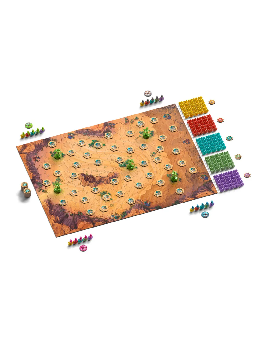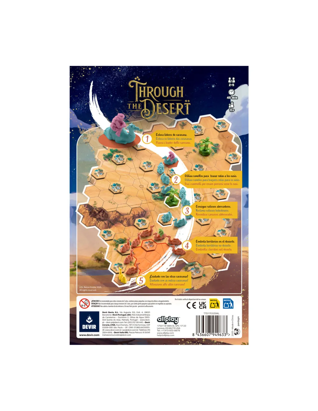 ¡Vuelve uno de los grandes abstractos clàsicos del genio Reiner Knizia! En este juego de estrategia, espacio y un montón de camellos, tendrás que liderar una tribu nómada para conseguir más puntos que tus rivales, establecer rutas, dominar oasis y tratar de aislar los camellos de los rivales para ganar.