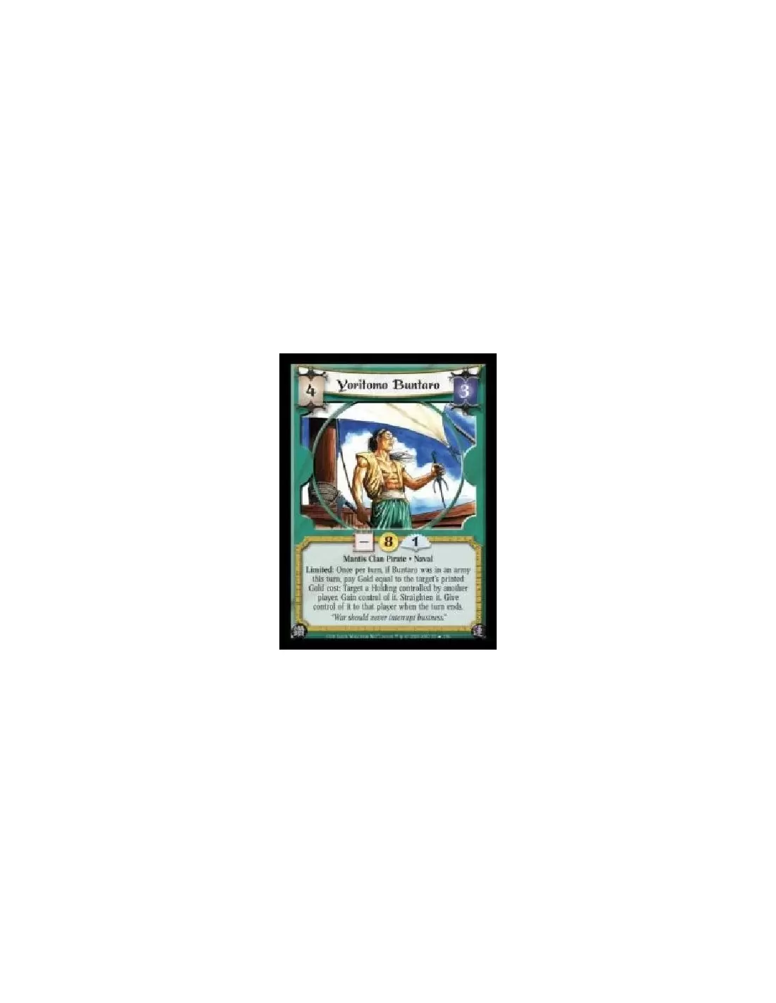 Mantis Clan Pirate · Naval. Limited: Once per turn, if Buntaro was in an army this turn, pay Gold equal to the target's printed Gold cost: Target a Holding controlled by another player. Gain control of it. Straighten it. Give control of it to that player when the turn ends.