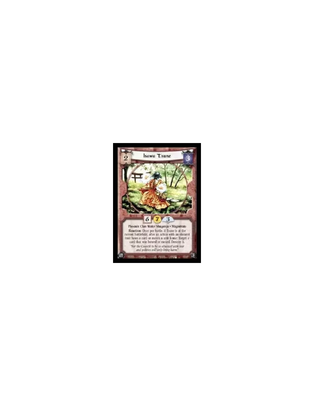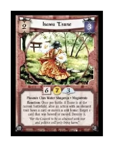 Phoenix Clan Water Shugenja · Magistrate. Reaction: Once per battle, if Tsune is at the current battlefield, after an action with an element trait bows a card or moves a unit home: Target a card that was bowed or moved. Destroy it.