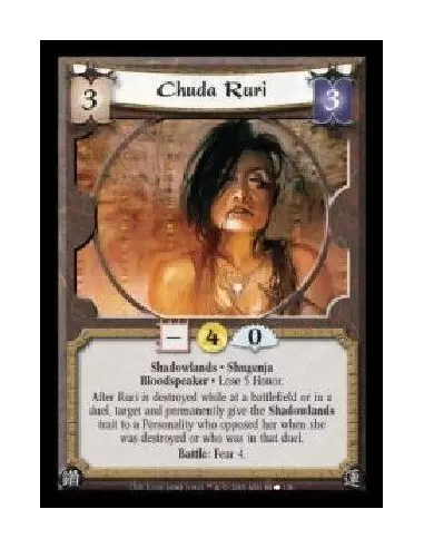 Shadowlands · Shugenja · Bloodspeaker · Lose 5 Honor. After Ruri is destroyed while at a battlefield or in a duel, target and permanently give the Shadowlands trait to a Personality who opposed her when she was destroyed or who was in that duel. Battle: Fear 4