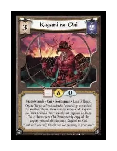 Shadowlands · Oni · Nonhuman · Lose 3 Honor. Open: Target a Shadowlands Personality controlled by another player. Permanently remove all Kagami no Oni's abilities. Permanently set Kagami no Oni's Chi to the target's Chi. Permanently copy all the target's printed abilities onto Kagami no Oni