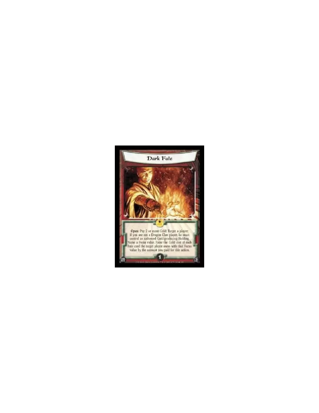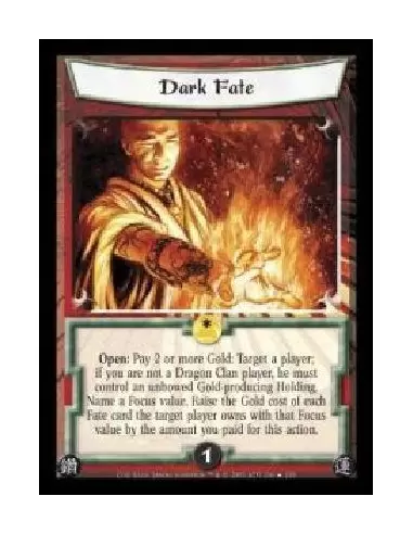 Open: Pay 2 or more Gold: Target a player; if you are not a Dragon Clan player, he must control an unbowed Gold-producing Holding. Name a Focus value. Raise the Gold cost of each Fate card the target player owns with that Focus value by the amount you paid for this action.