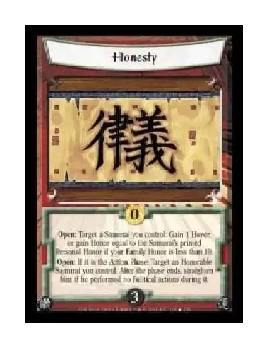 Open: Target a Samurai you control: Gain 1 Honor, or gain Honor equal to the Samurai's printed Personal Honor if your Family Honor is less than 10. Open: If it is the Action Phase: Target an Honorable Samurai you control. After the phase ends, straighten him if he performed no Political actions during it.